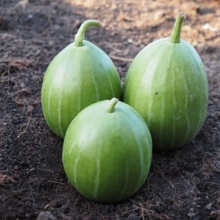 ทรงผลกลมรี ผิวลายทางเขียวอ่อน น้ำหนัก 120-140กรัม